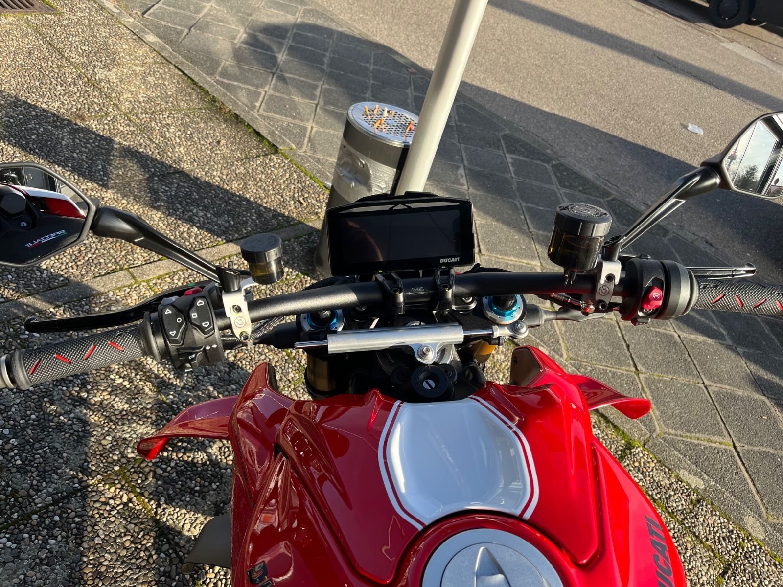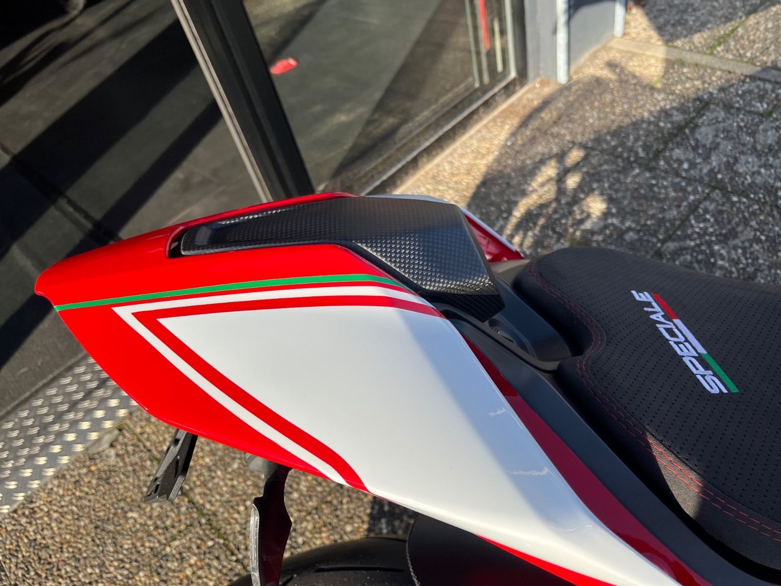 Sonderlackierung Heck, Tankabdeckung, Lampenmaske, Kotflügel vorn. Kennzeichen Halter inkl. Ducati Performance LED Laufblinker. Racing Sitzbank. Carbon Kotflügel vorn